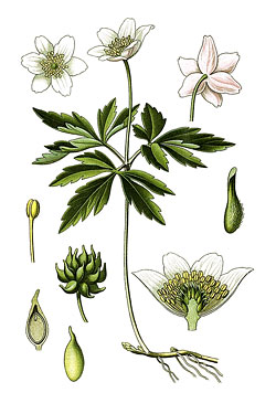 Bewerkte botanische illustratie van bosanemoon (Anemone nemorosa).