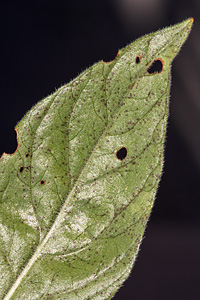 De eironde tot langwerpige, behaarde en gewimperde, kortgesteelde bladeren zitten met 3 of 4 in kransen aan de rechtopstaande zacht behaarde stengels. Ze zijn aan de onderkant beklierd.