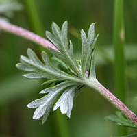 De bladeren zijn handvormig samengesteld, meestal 5-tallig. Aan de bovenkant zijn ze groen, de onderkant is wit viltig. De deelblaadjes zijn gelobd met hooguit 9 lobjes. Evenals de bladeren zijn ook de kelk- en bijkelkbladen, de bloemstelen en de stengel wit viltig. De wit viltige beharing kan na verloop van tijd wat slijten.