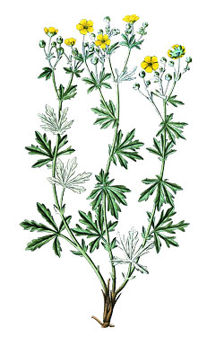 Bewerkte botanische illustratie van viltganzerik (Potentilla argentea).