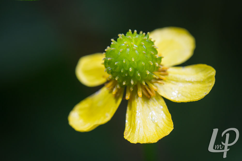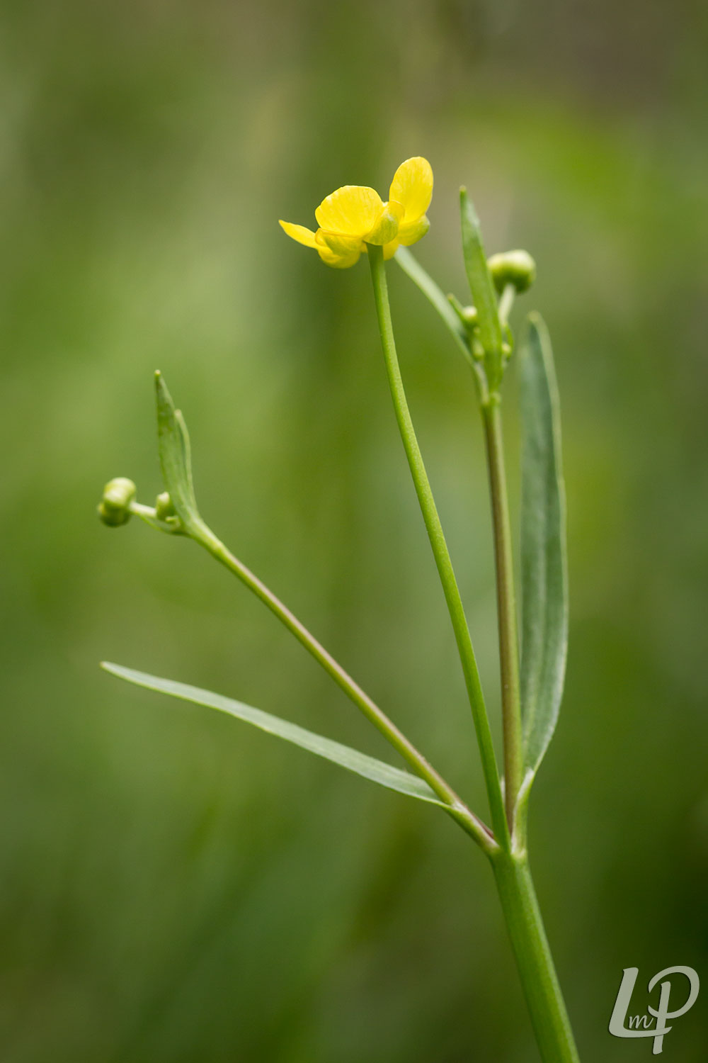 de 5-tallige, gele, glanzende, vrij kleine boterbloemen én de enkelvoudige, langwerpige tot lijnvormige bladeren.
