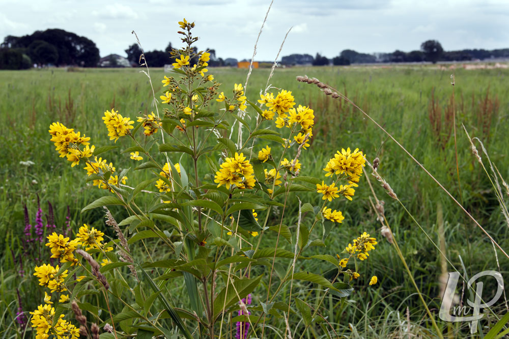 gele bloemen in schijnkransen in langgerekte bebladerde pluimen, kelkbladen geheel groen, kroonbladen gewimperd.