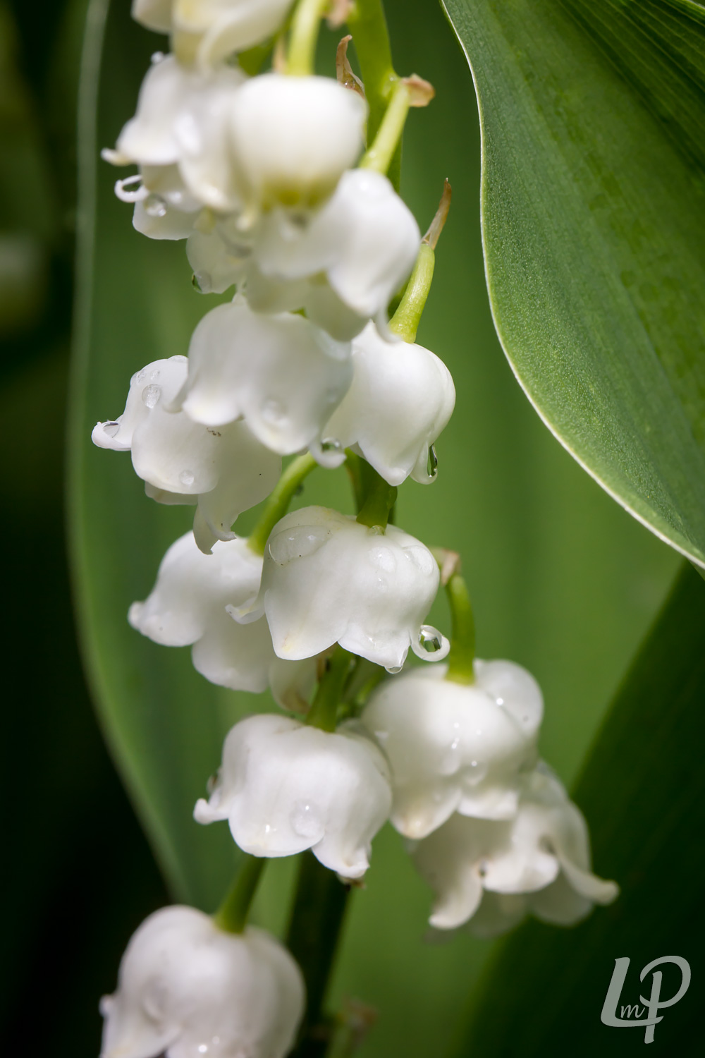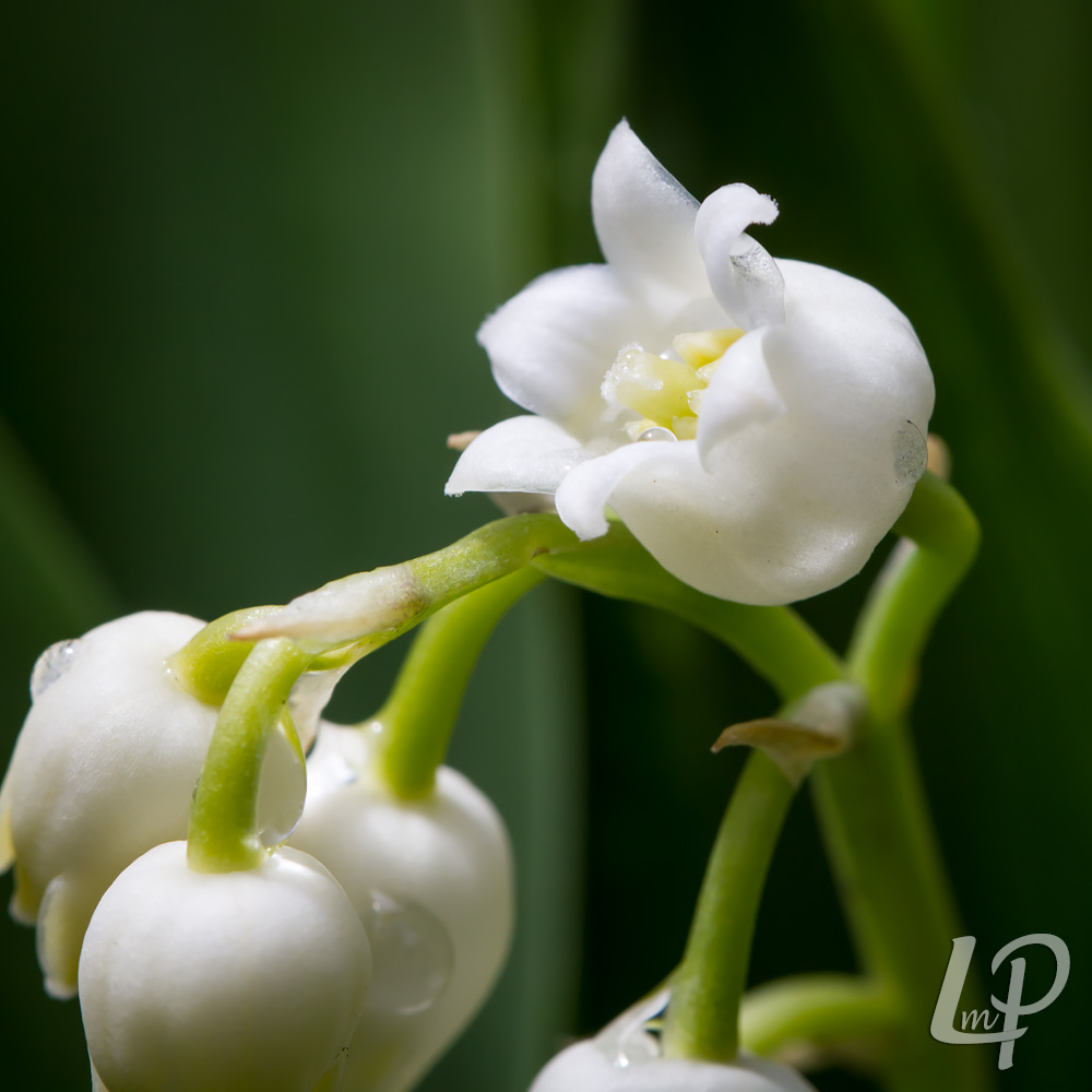 de witte, aangenaam zoet geurende, klokvormige bloemetjes in een éénzijdige tros.