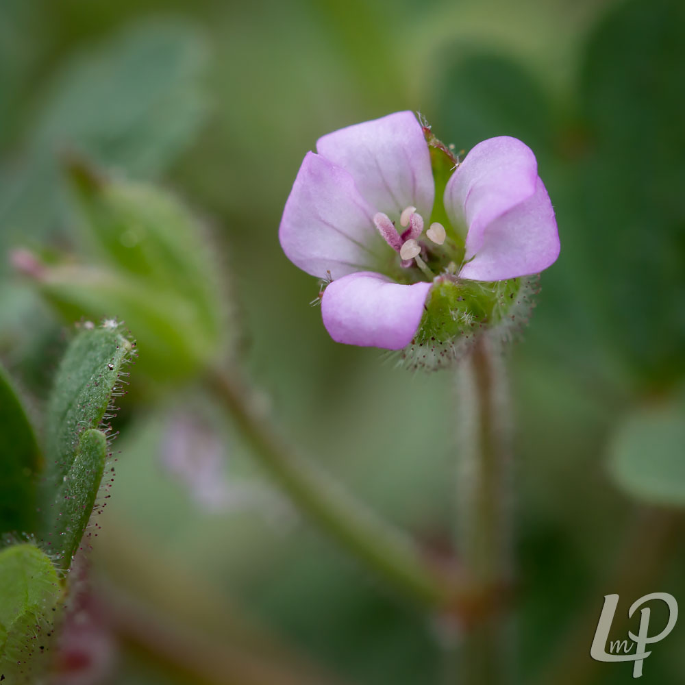 de kleine roze bloemetjes met 5 kroonbladen met ronde of iets uitgerande top met ondiepe inkeping én de in omtrek ronde bladeren én de beharing van de plant; alle delen, behalve de kroonbladen zijn behaard, ook met klierharen.