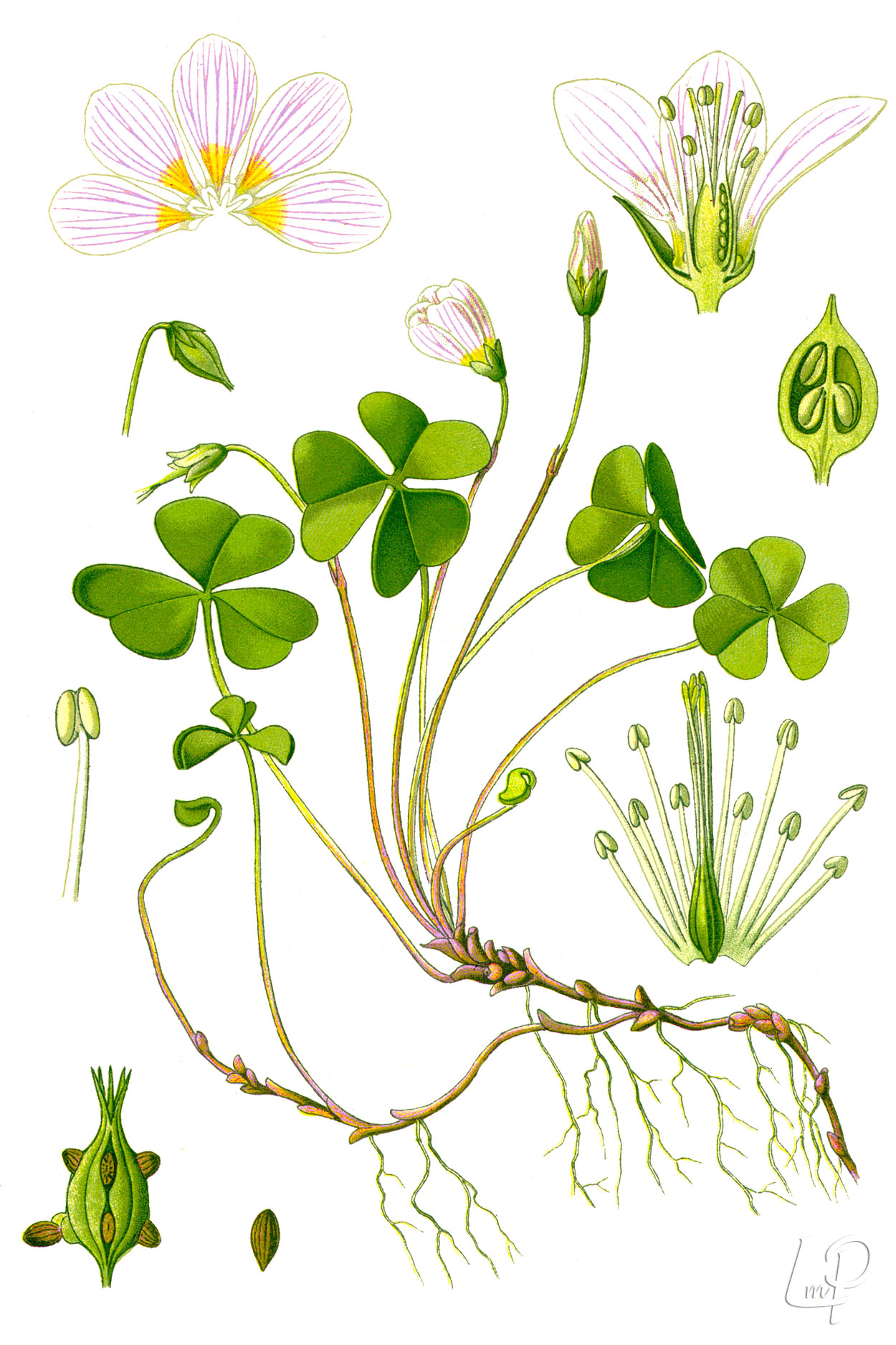 de paars geaderde witte bloemen op lange stelen én het 3-delige klaverblad met breed hartvormige deelblaadjes.