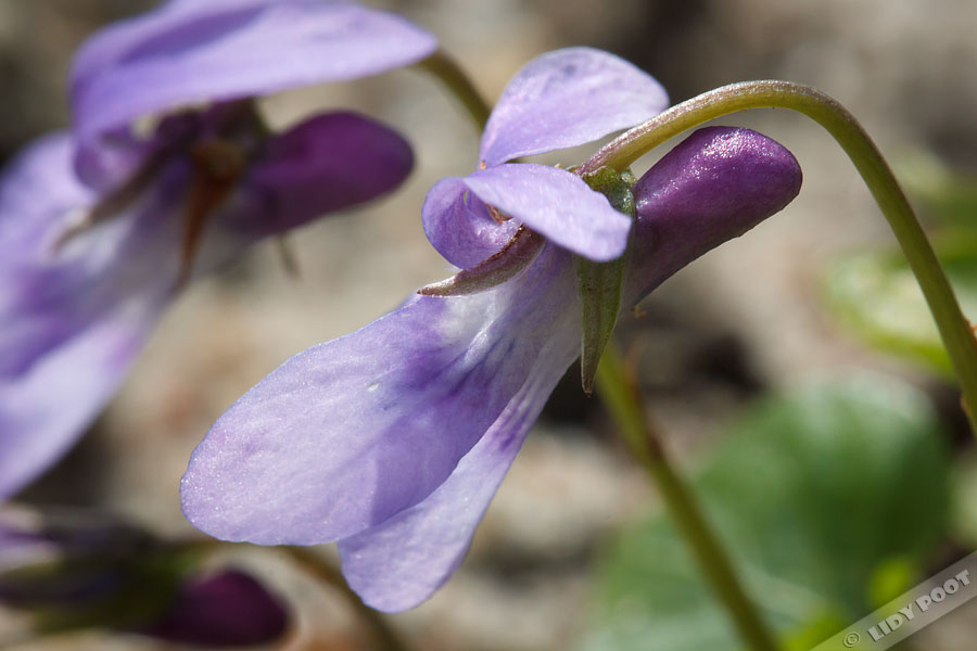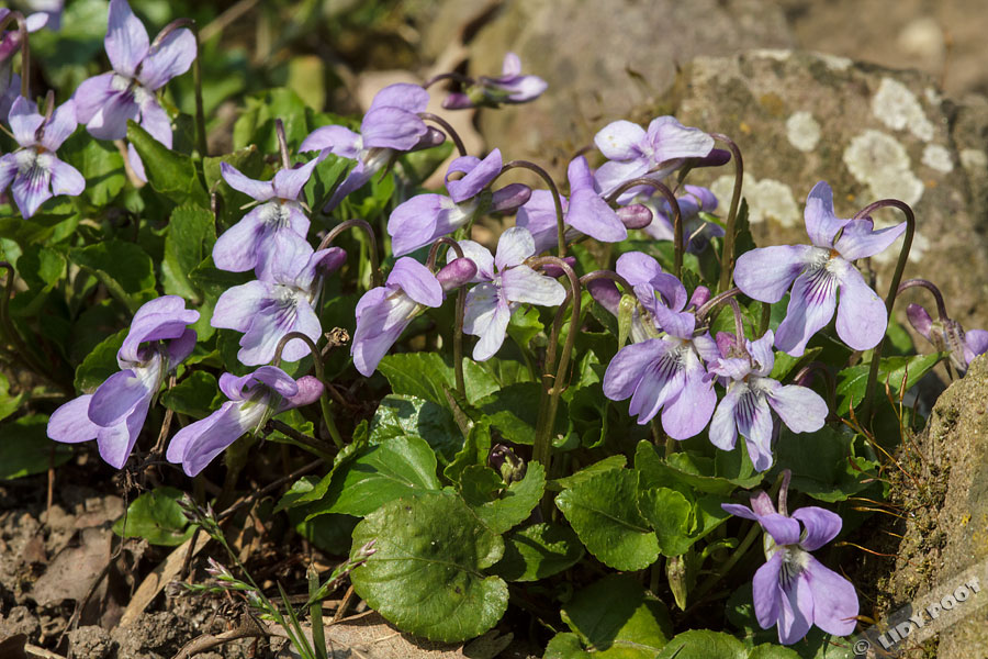 Bewerkte botanische illustratie van donkersporig bosviooltje (Viola reichenbachiana).
