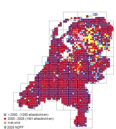 Ze is algemeen voorkomend, maar vrij zeldzaam in Zuid-Limburg en Twente, zeldzaam in Drenthe, de IJsselmeerpolders en op de Waddeneilanden, behalve Texel waar ze algemeen voorkomt.
