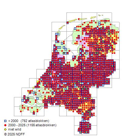 In Gelderland, Utrecht, Limburg en de duingebieden is ze algemeen tot vrij algemeen. Elders is ze zeldzaam.