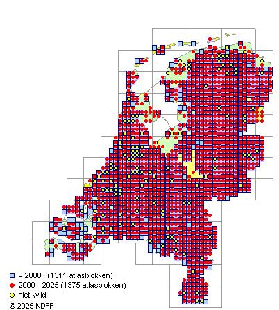 Ze is zeer algemeen voorkomend, behalve op de Waddeneilanden, in de IJsselmeerpolders, het noorden van Friesland en Groningen en in Zeeland, waar ze zeldzaam is.