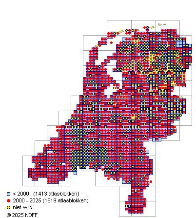 Ze is zeer algemeen voorkomend in Zeeland, het rivierengebied, Noord-Brabant, Noord-Holland, het noorden van Groningen en Friesland, de Waddeneilanden en Zuid-Limburg. Elders is ze vrij zeldzaam.
