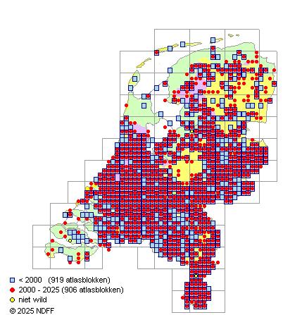 Ze is algemeen in het rivierengebied en Zuid-en Noord-Holland tot aan Alkmaar, met uitzondering van de stedelijke en de duingebieden; vrij zeldzaam in Limburg, Drenthe, Overijsel, Gelderland en Noord-Brabant, elders zeer zeldzaam.