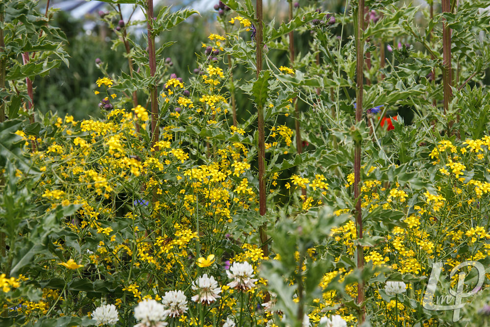 Akkerkers met witte klaver, korenbloem, akkerdistel en klaproos.
