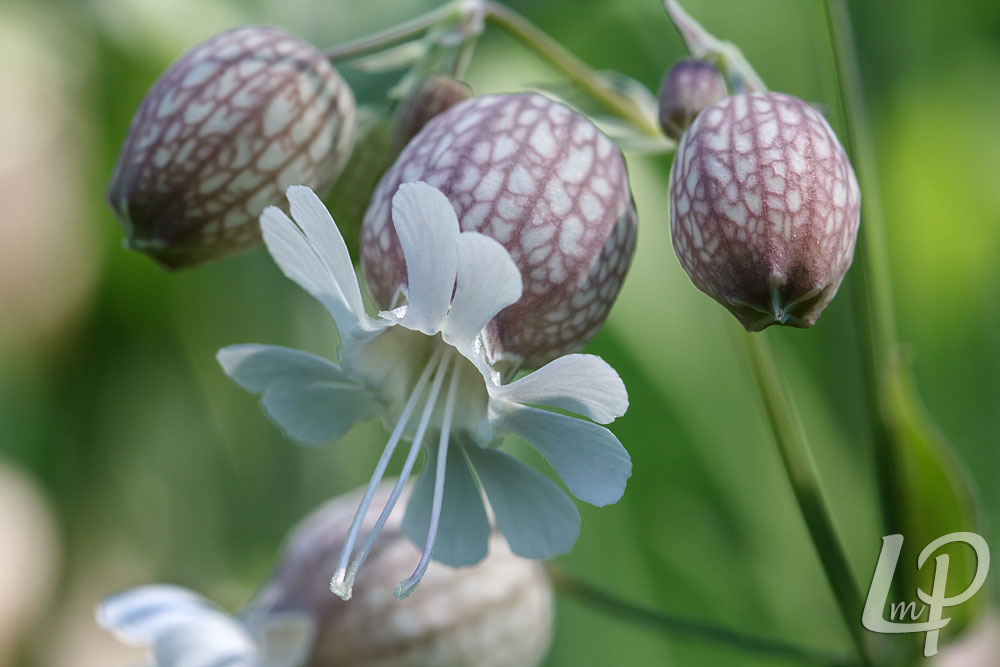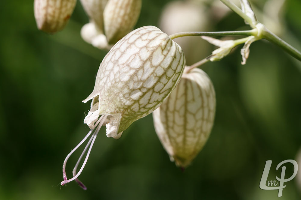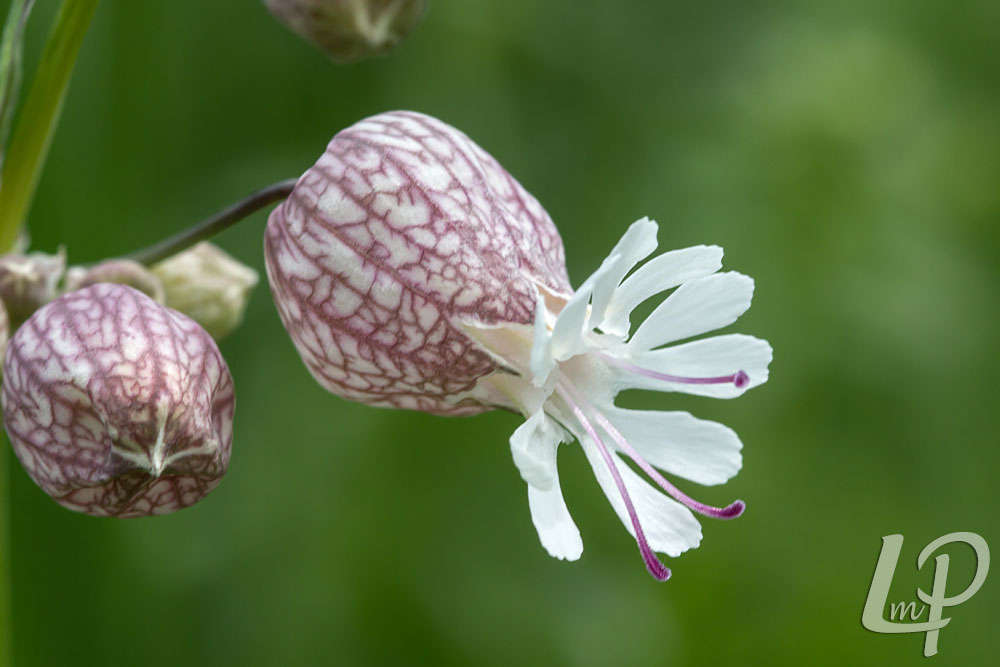 de opgeblazen kelk met 20 fijne, onderling verbonden nerven én de 5, stervormig uit de kelk stekende, witte kroonbladen.