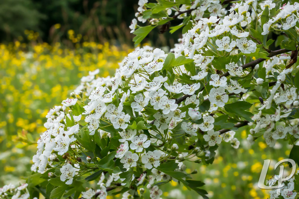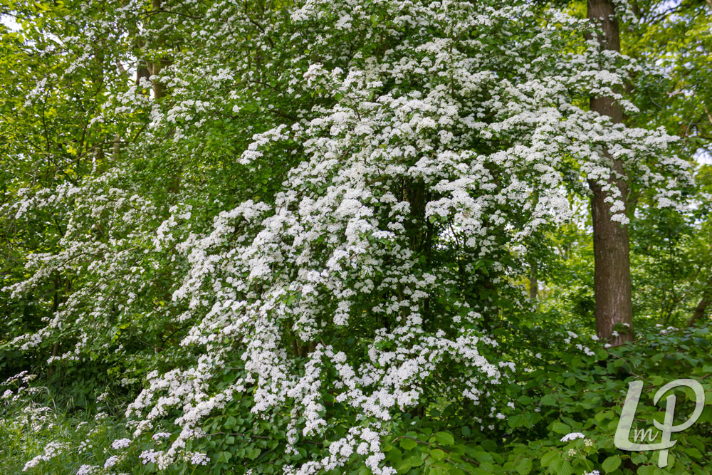 Eenstijlige meidoorn bloeit met een overdaad aan witte, zoet (wat weeeïg) geurende bloemetjes.