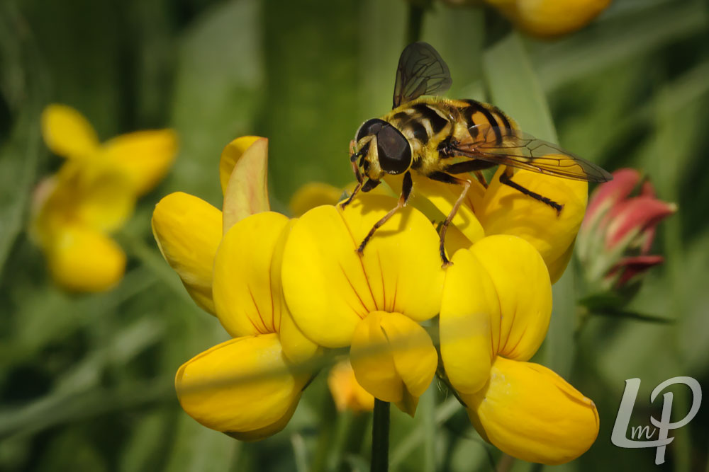 Gewone rolklaver (Lotus corniculatus) met doodshoofdzweefvlieg (Myatropha florea). De knoppen van gewone rolklaver zijn meestal rood aangelopen.
