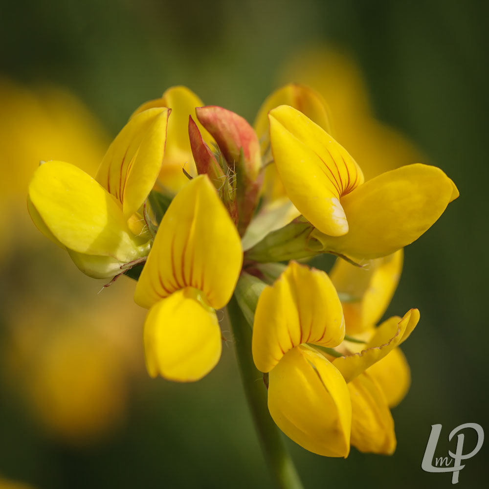 kleine, schermachtige trossen dooiergele vlinderbloemen, in de knop meestal rood én