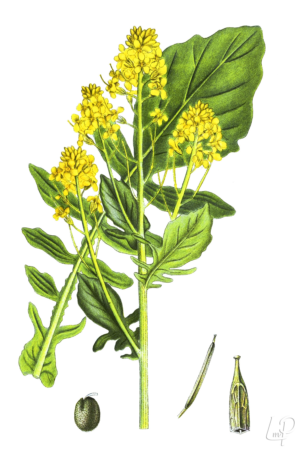 de 4-tallige helder gele bloemen én de glanzende, niet gesteelde bovenste bladeren met bochtig ingesneden rand.