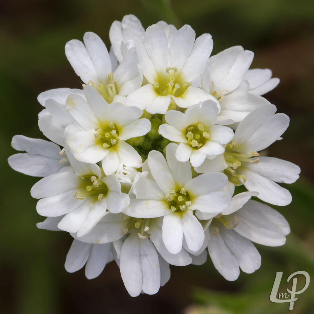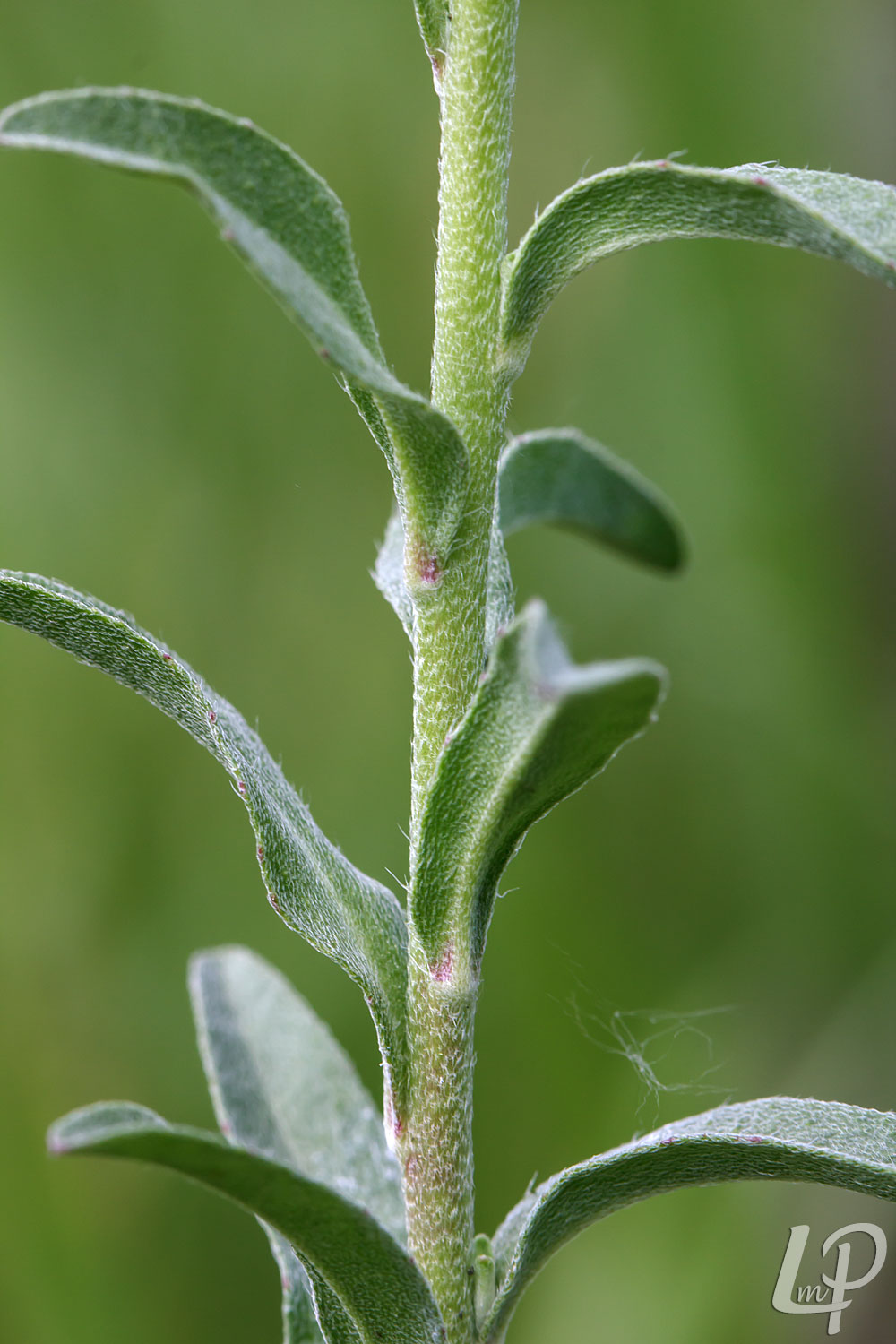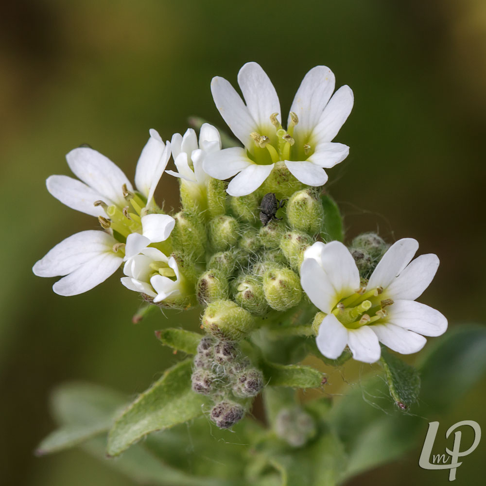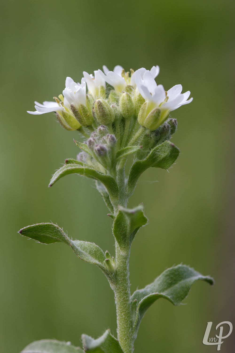 de kleine witte bloemetjes, die in een dichte tros aan het einde van de stengel staan én de door beharing grijsgroene bladeren en stengels.