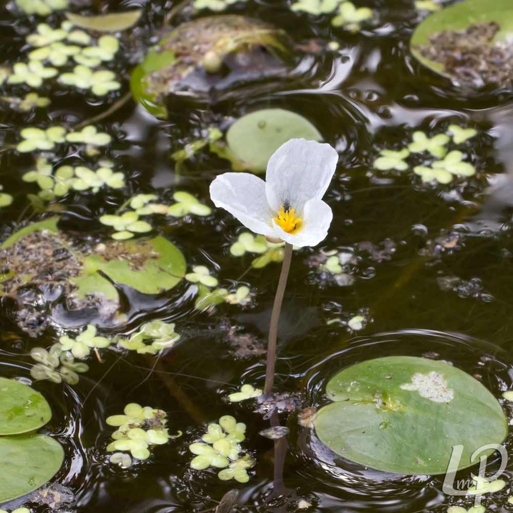 de kleine, witte bloemen op een lange steel boven water én de op het water drijvende, ronde bladeren met hartvormige voet en opvallende kromme nerven.