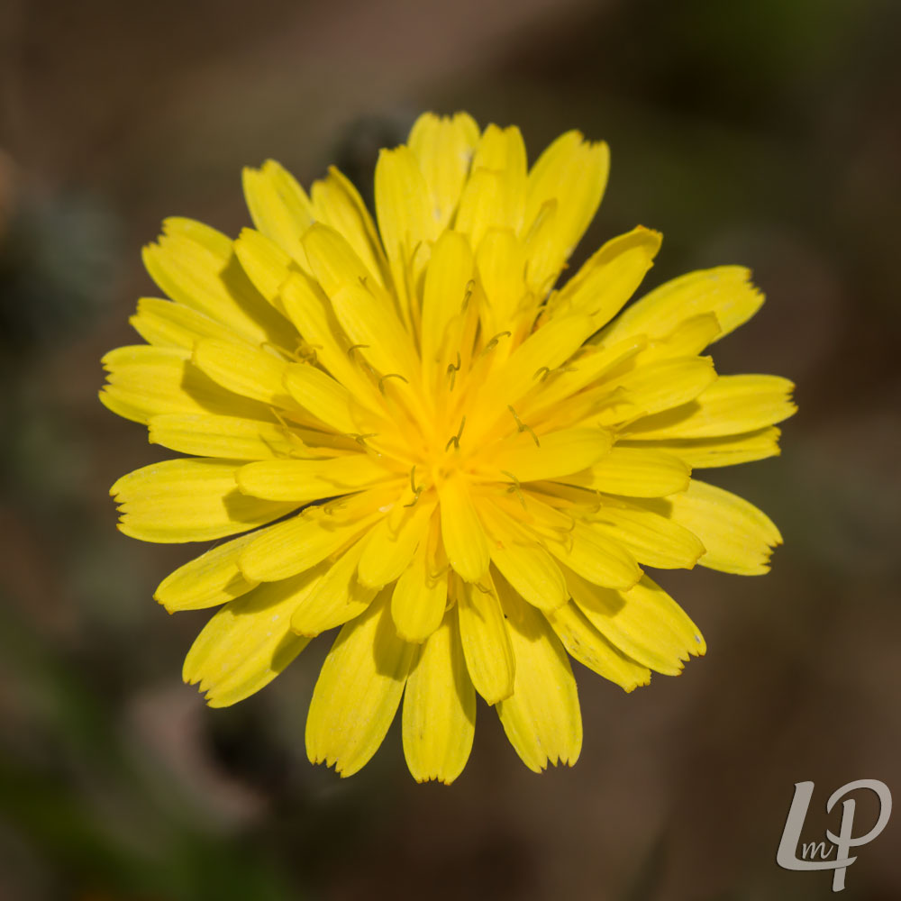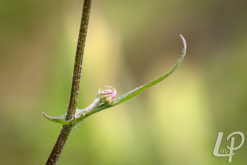 de kleine paardenbloem-achtige hoofdjes met vuilgele stijlen én de smalle stengelbladeren, die met oortjes de stengel gedeeltelijk omvatten.