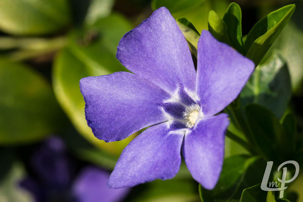 de grote, lichtblauwe of blauwpaarse, 5-tallige bloemen aan een bodembedekkende plant én de in de winter groen blijvende, glanzende bladeren met kale rand.