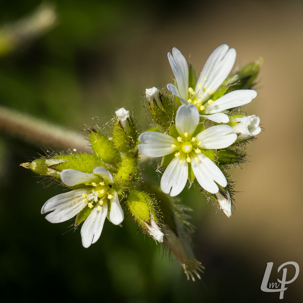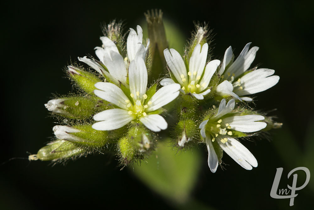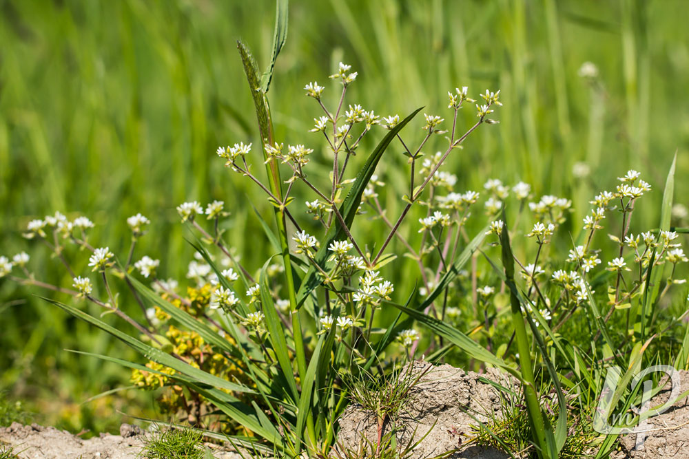 de kleine witte bloemetjes met 5 tot 1/4 ingesneden kroonbladen in een gedrongen, dichte bloeiwijze én de behaarde stengels, die vooral bovenaan kleverig zijn door klierharen.