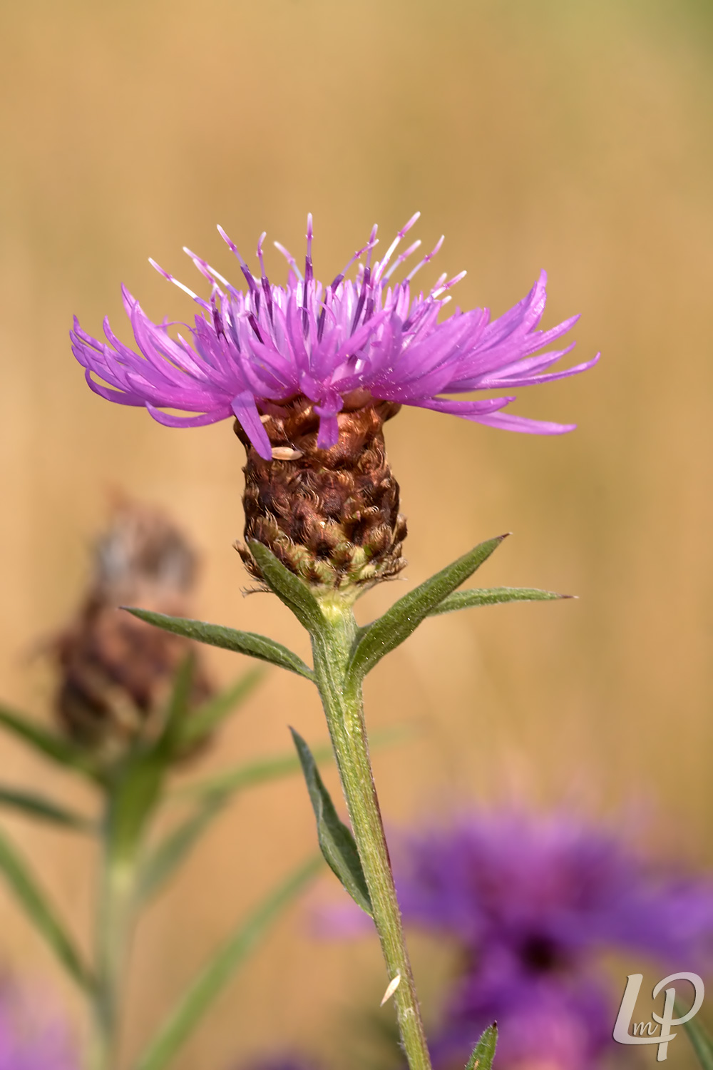 de helder roze bloemenhoofdjes, die met buitenste, vergrote randbloemen lijken op korenbloemen, zonder de vergrote randbloemen op distelbloemen én de ongedeelde stengelbladeren tot vlak onder het bloemhoofdje.