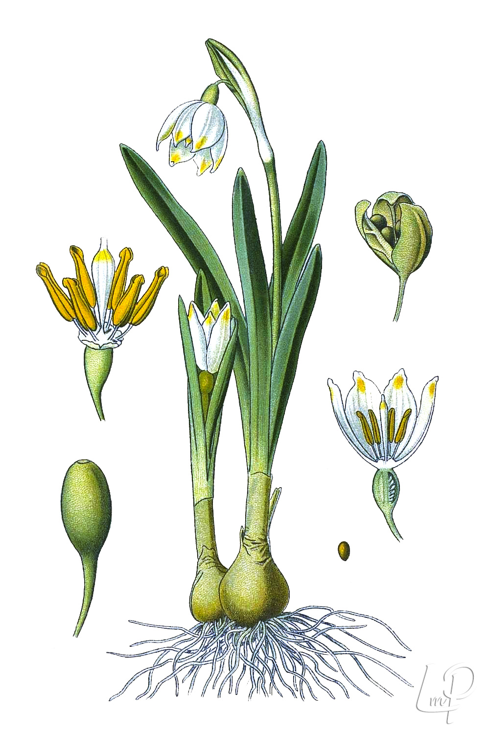 de zoet geurende, witte, klokvormige, hangende bloemen, meestal alleen (soms 2) per stengel, met 6 vrijwel gelijke bloemdekbladen, die aan de top groen of geel gevlekt zijn.
