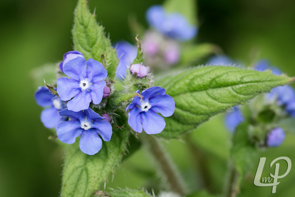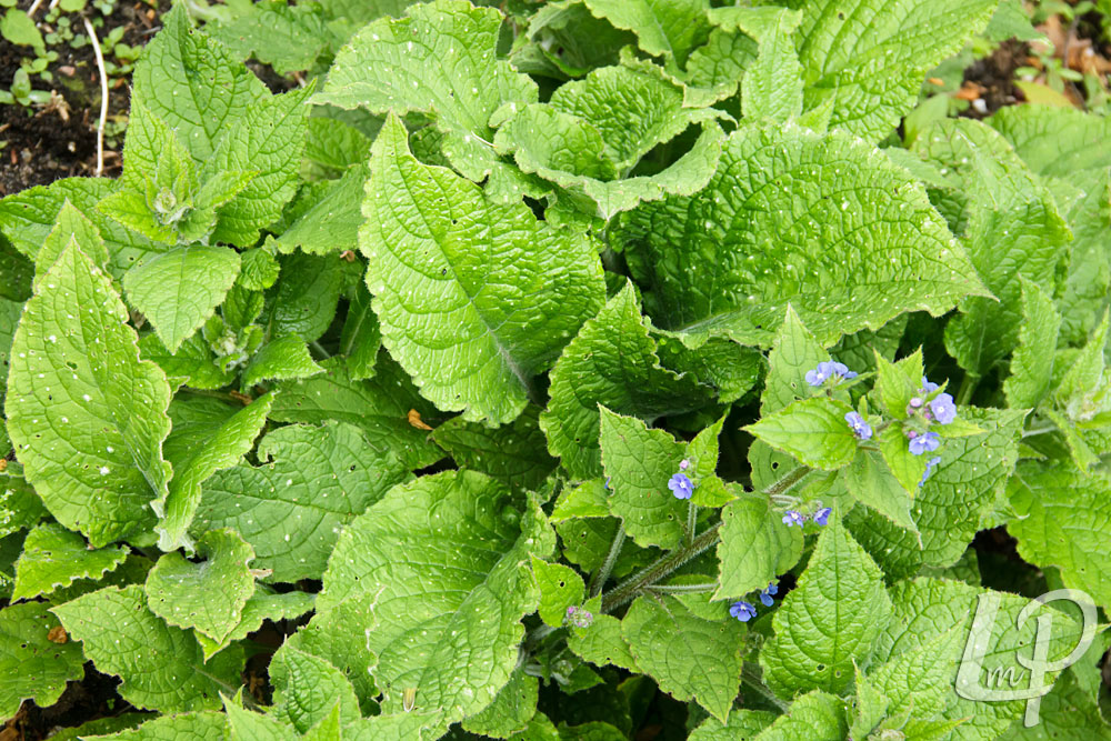 de blauwe bloemen in een dubbele schicht én de ruwe beharing van de hele plant én de onderste, grote bladeren, meestal verspreid wit gevlekt.