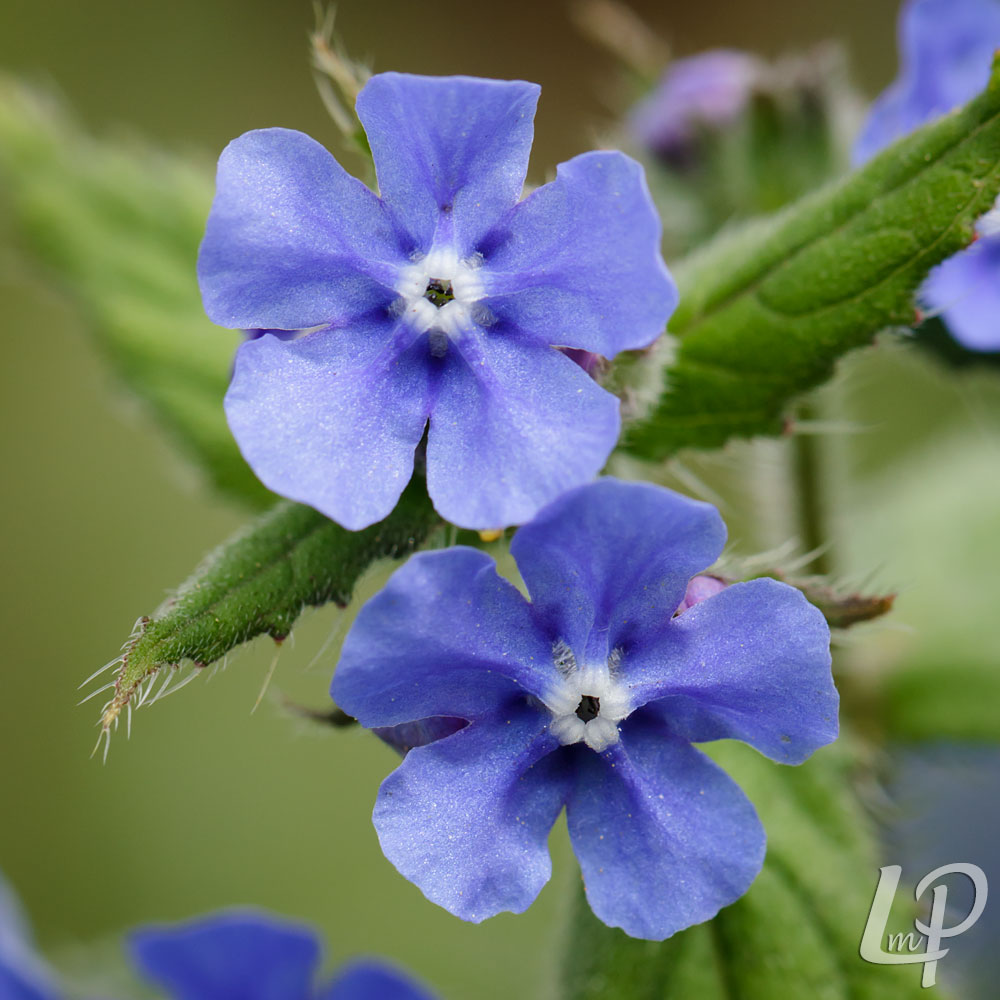 De bloemen hebben 5 kroonbladen en 5 witte keelschubben.