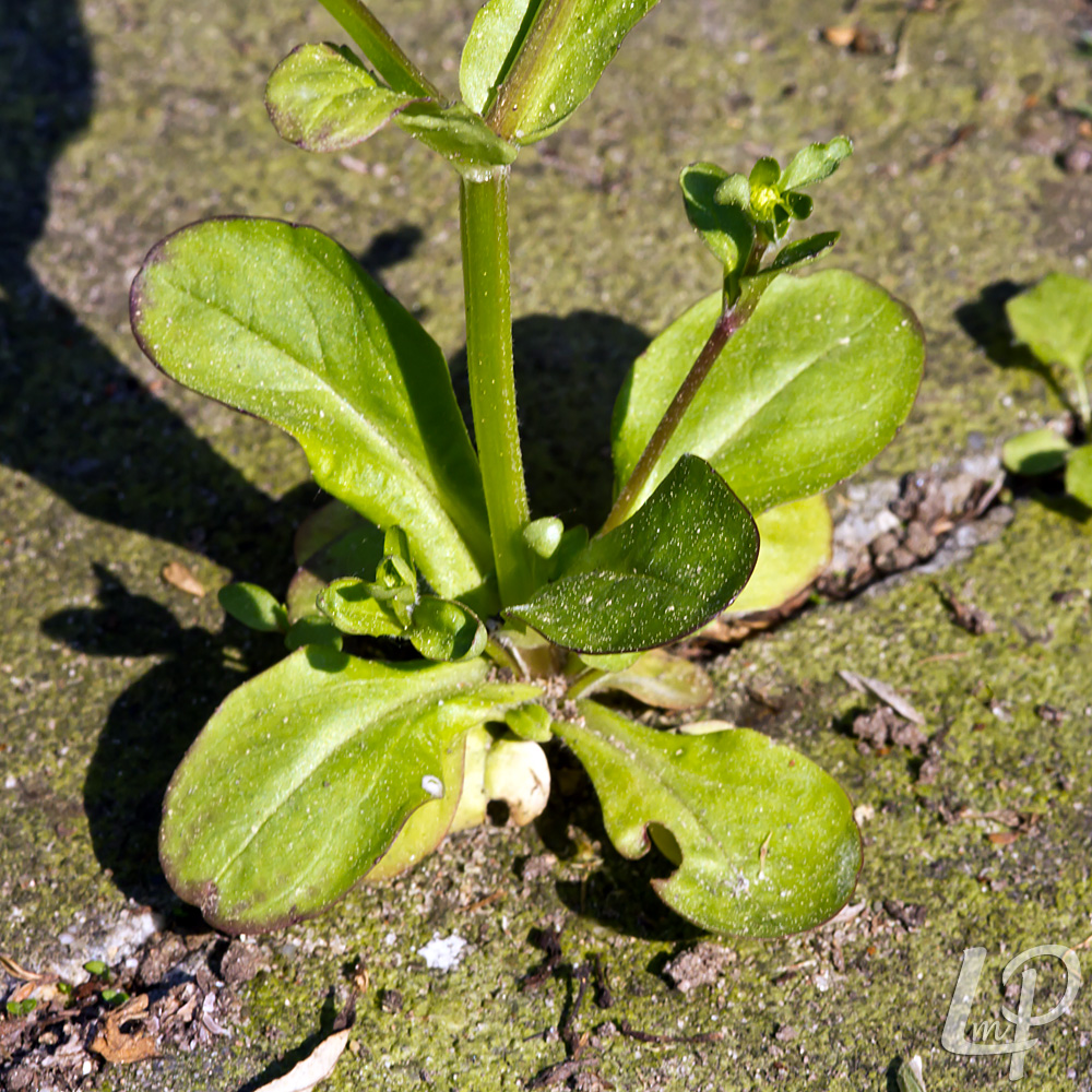 De onderste bladeren vormen een rozet en zijn spatelvormig.