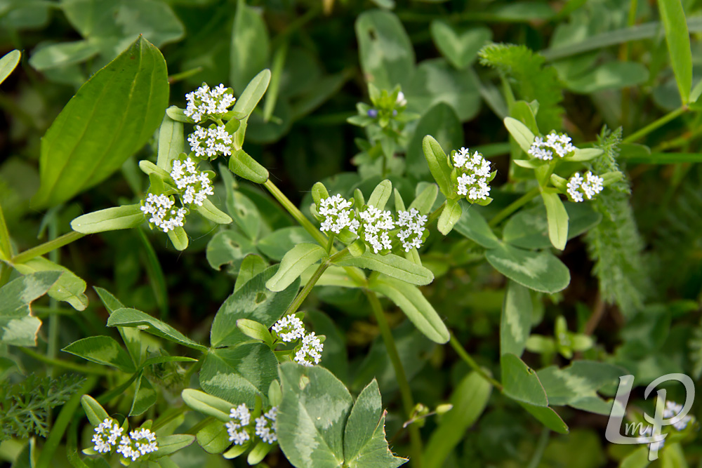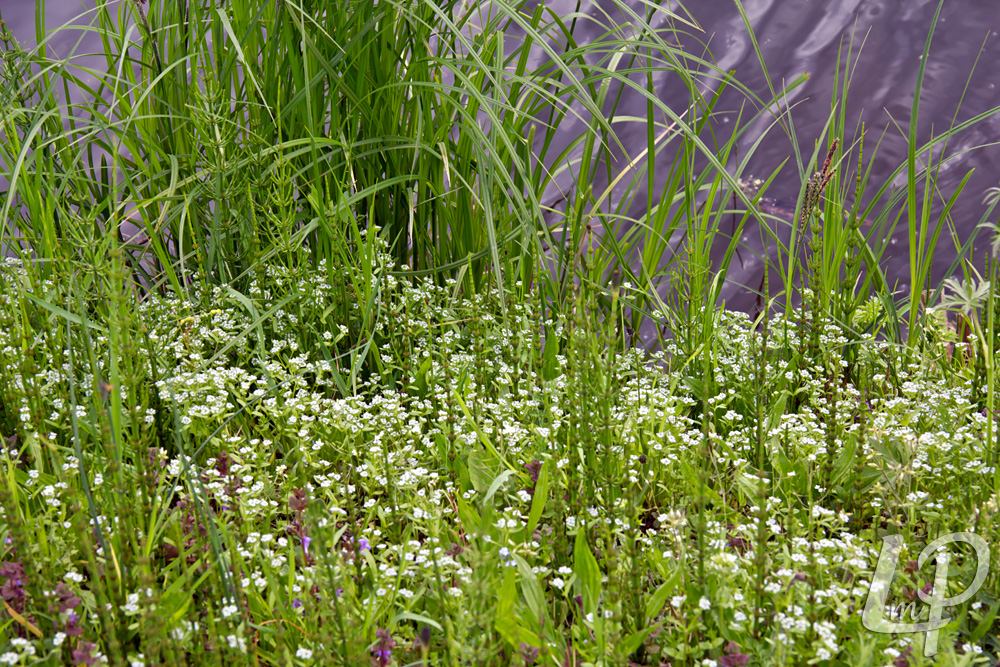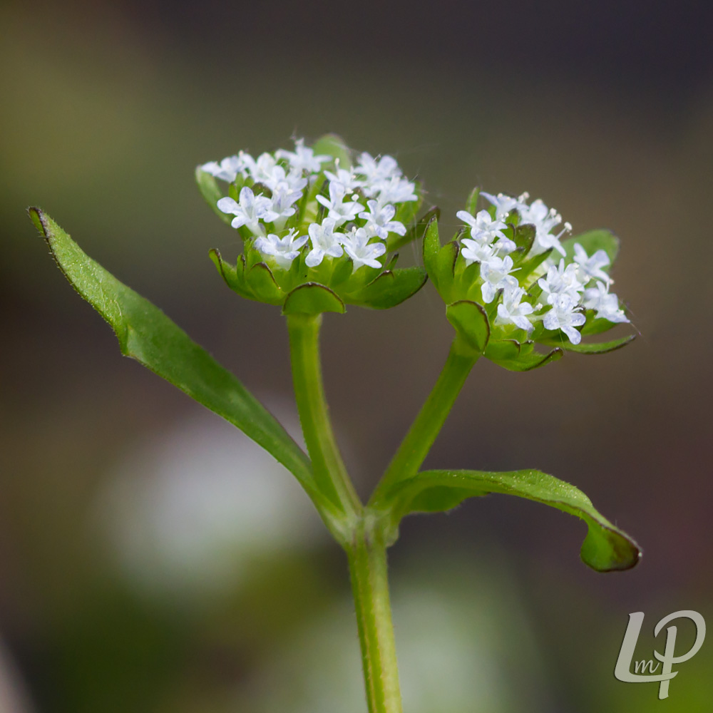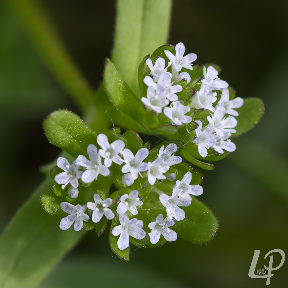 de hele kleine (2 mm) lichtblauwe (bijna witte) bloemetjes in schermachtige hoofdjes, die paarsgewijs aan het einde van een gevorkte stengel zitten.