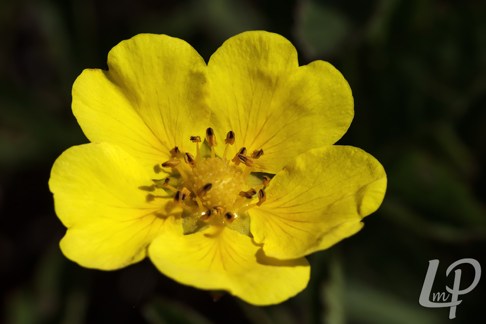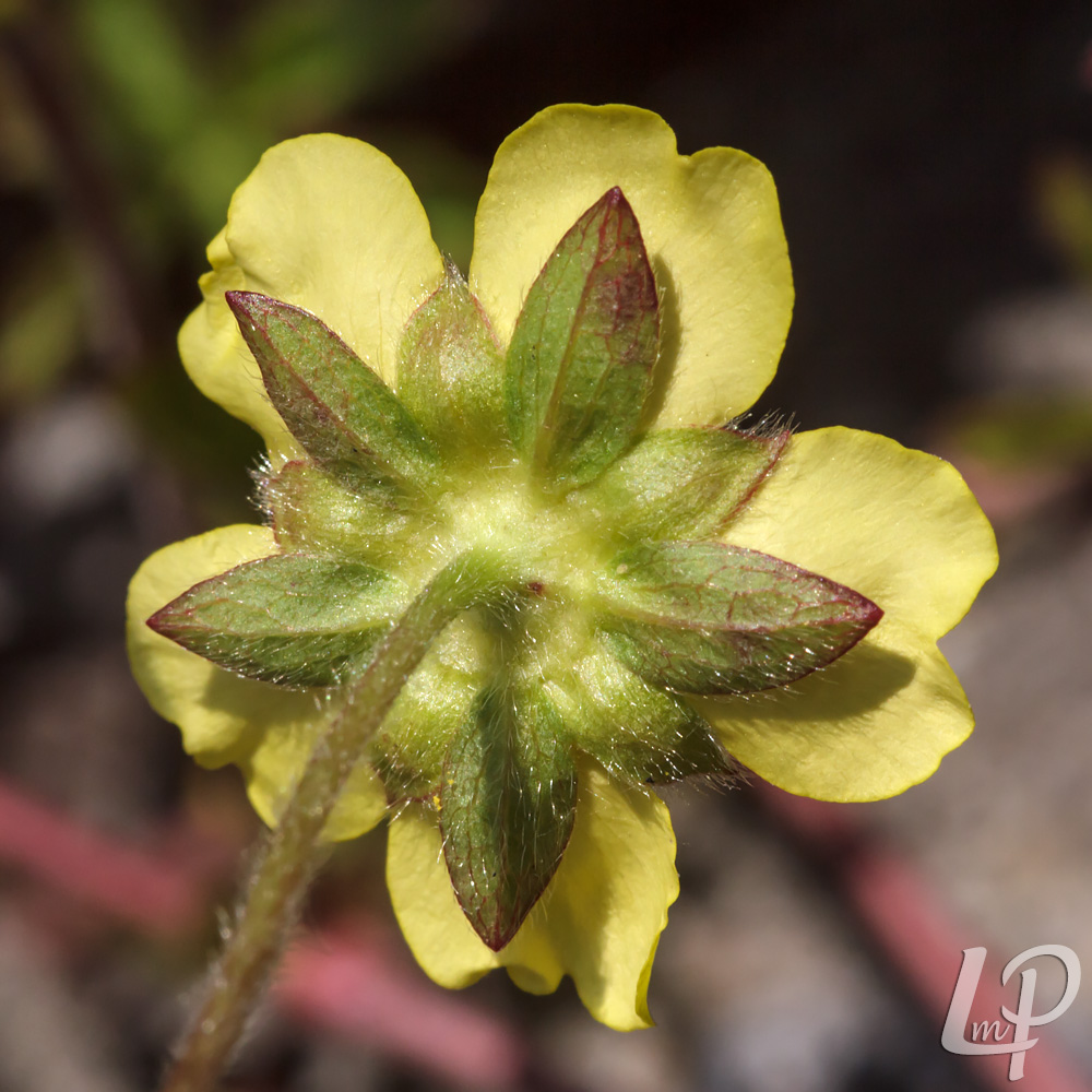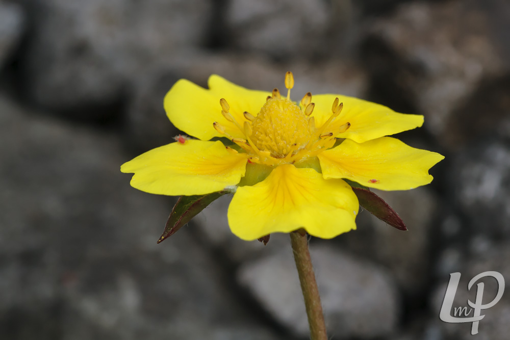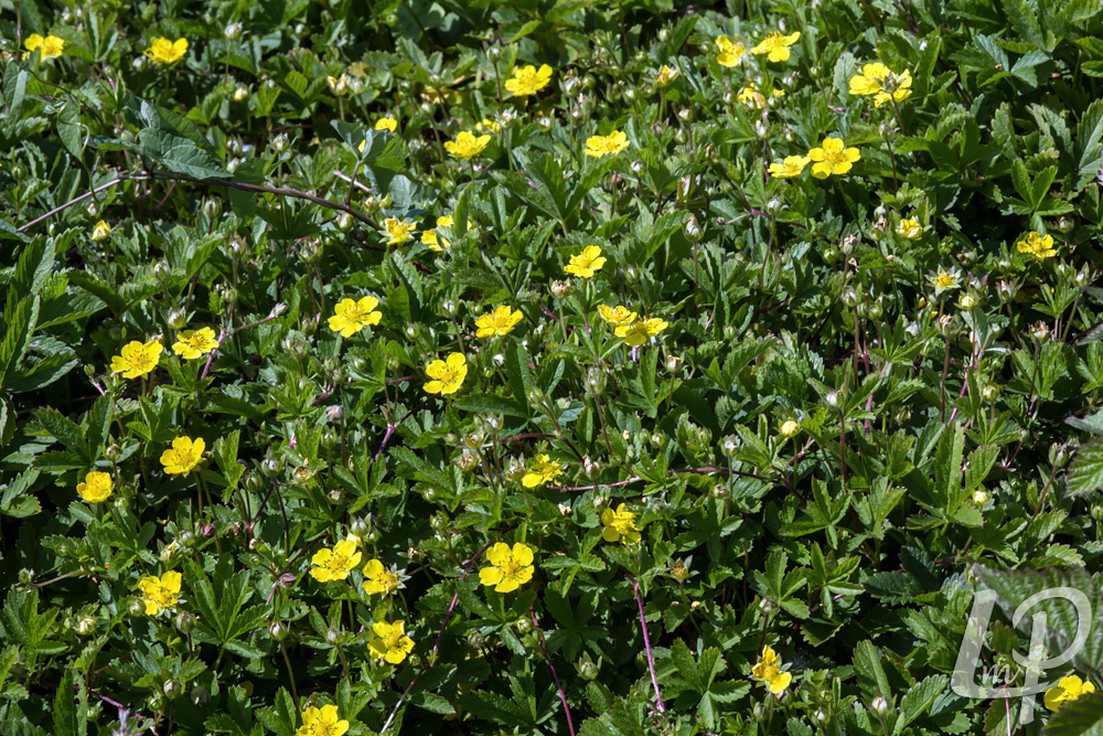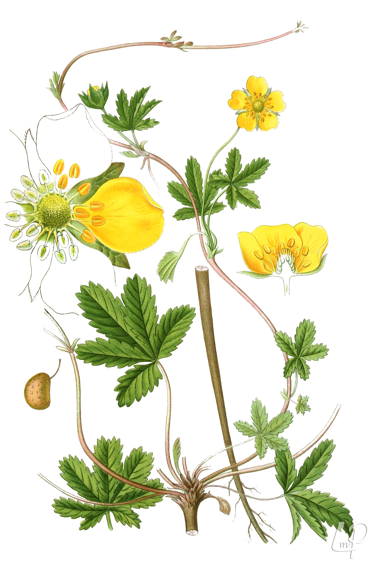 de gele, gesteeld alleenstaande bloemen met 5 (soms 4) hartvormige kroonbladen én de handvormige samengestelde, 5-tallige bladeren (soms deels 7-tallig) én de vaak roodachtige, liggende, op de knopen wortelende stengels.