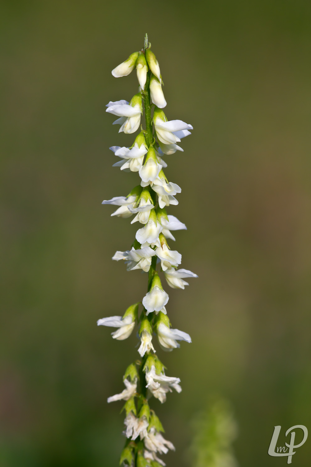 de witte vlinderbloemen, die los gerangschikt zitten in smalle langgerekte trossen.