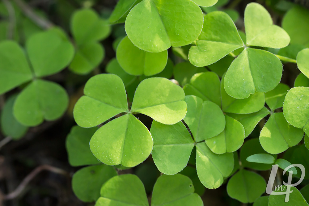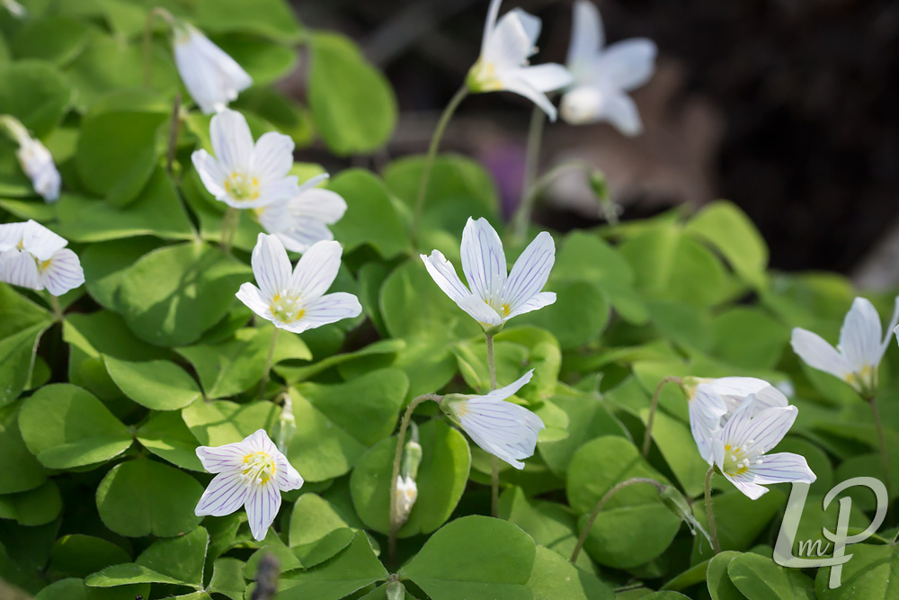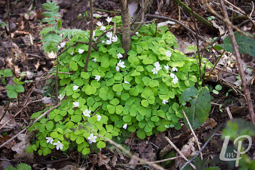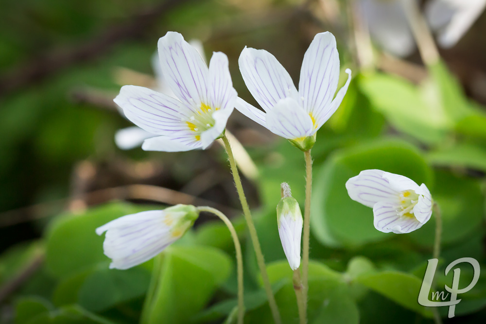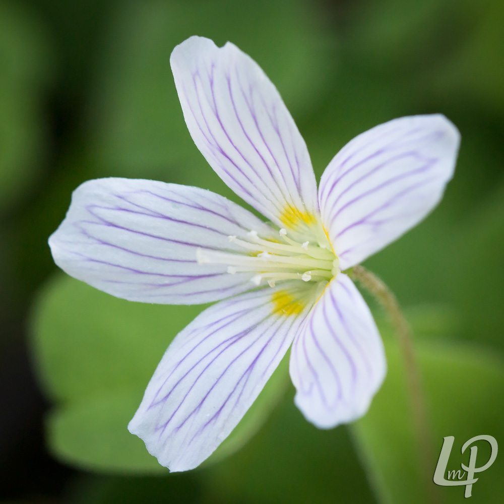 de paars geaderde witte bloemen op lange stelen én het 3-delige klaverblad met breed hartvormige deelblaadjes.