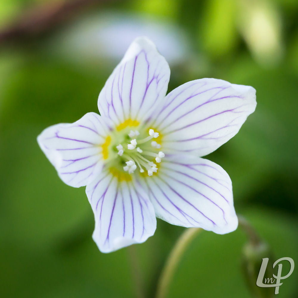 De witte (soms roze) bloemen hebben 5 paars geaderde kroonbladen.
