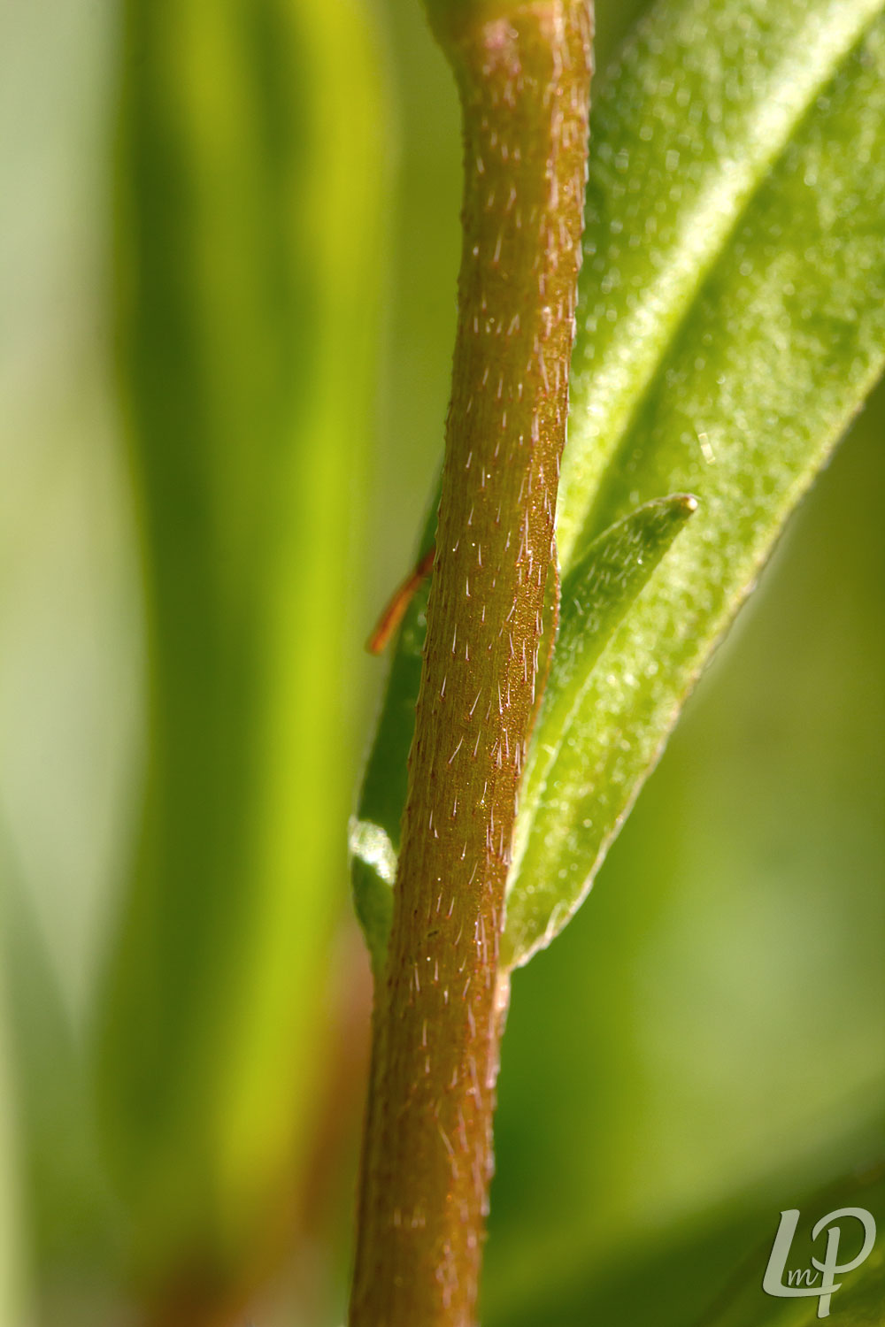 Op deze foto kun je zien hoe klein de bloemetjes zijn; links staat een rietstengel, rechts de paarse bloemen van hondsdraf en in de achtergrond het blad van watermunt.
