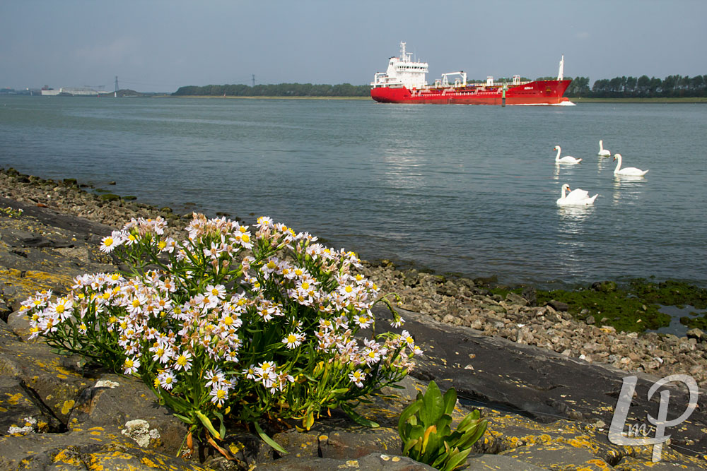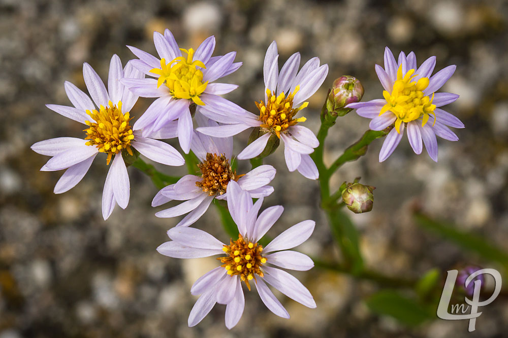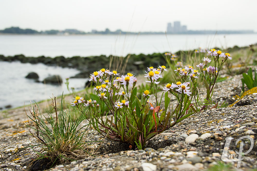 op herfstasters lijkende lichtpaarse bloemhoofdjes met een geel hartje (soms ontbreken de straalbloemen) én de groeiplaats; op zoute of brakke plaatsen.