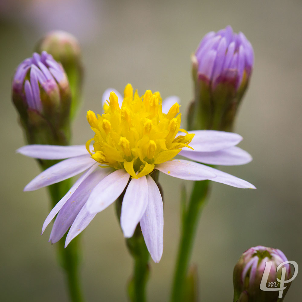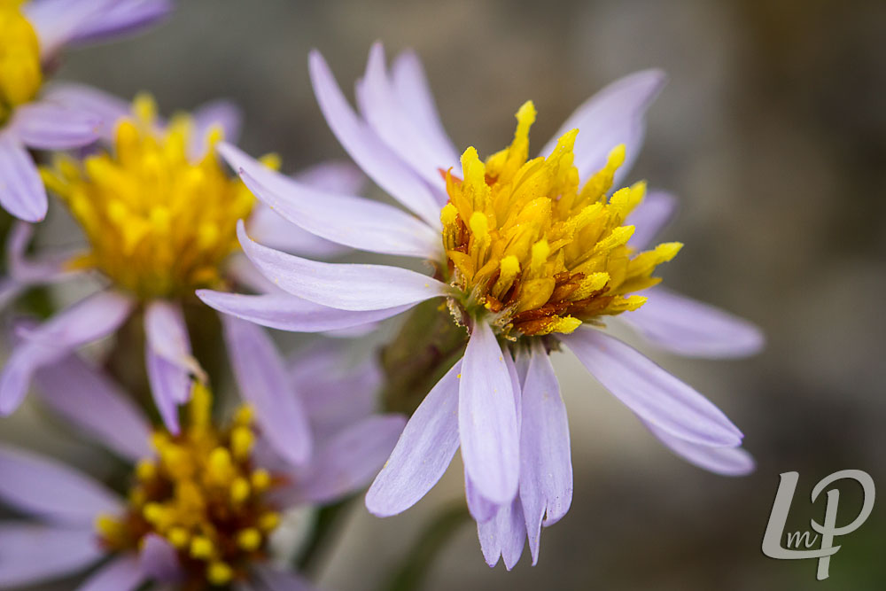 De bloemhoofdjes hebben lichtpaarse straalbloemen en een hartje van gele buisbloemen. De straalbloemen zijn 11 tot 17 mm lang.